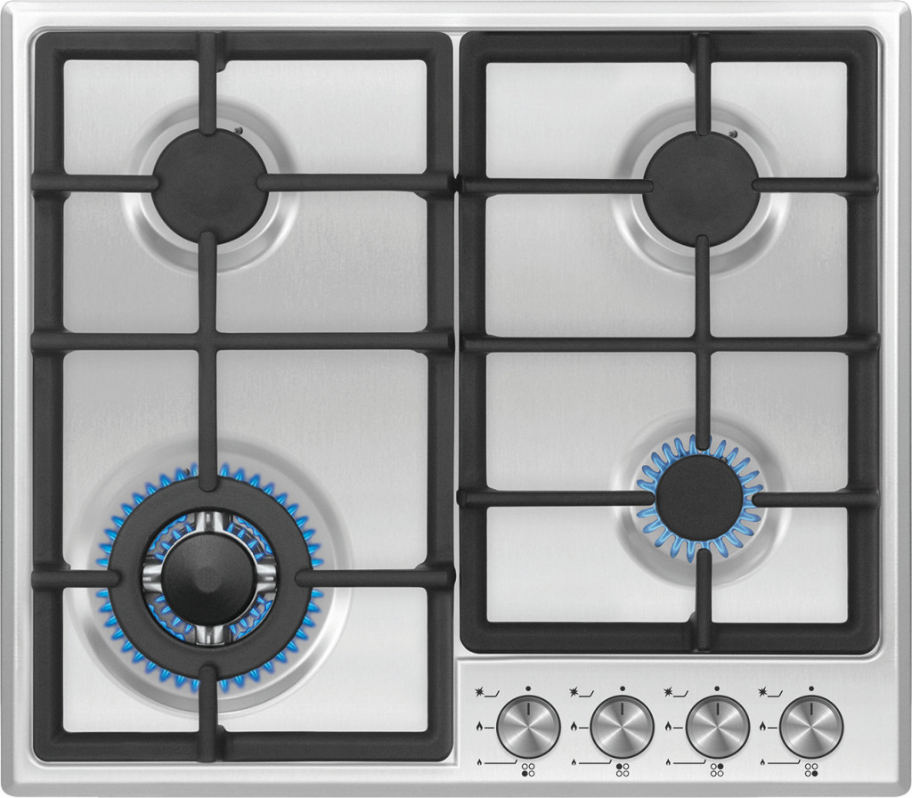 A főzőlap négy égővel rendelkezik, melyek között egy nagy teljesítményű égő, két közepes és egy kis égő található, így könnyedén kiválaszthatja a megfelelő lángméretet az adott ételhez. A névleges összteljesítmény: akár 9,05 kW, ami gyors és hatékony főzést biztosít.
