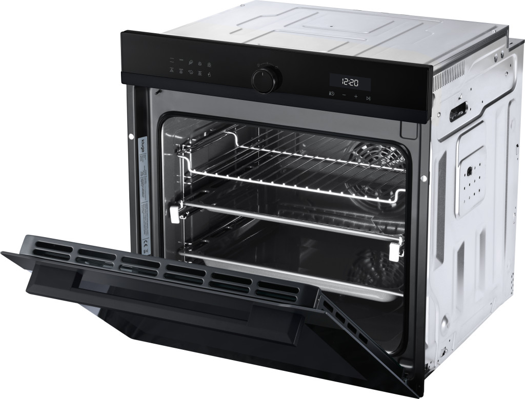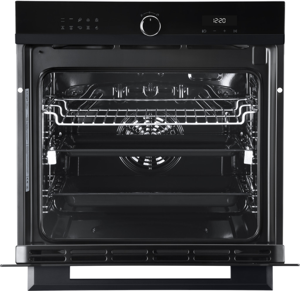 Multifunkciós sütő fekete kivitelben; fehér LCD kijelző fekete forgógombbal; 81 l sütőtérfogat; energiaosztály: A; Cool Touch – hideg ajtó 3 üvegréteggel és kivehető belső üveggel; 10 sütőprogram; gőztisztítás; gyerekzár; automatikus kikapcsolás; tartozékok: oldalsó tartórácsok, teleszkópsínek, biztonsági rács, mély és sekély sütőtálca; beépítési méretek (Ma×Sz×Mé): 59,6 × 56,5 × 56 cm; készülék méretei (Ma×Sz×Mé): 59,5 × 59,4 × 57,5 cm.