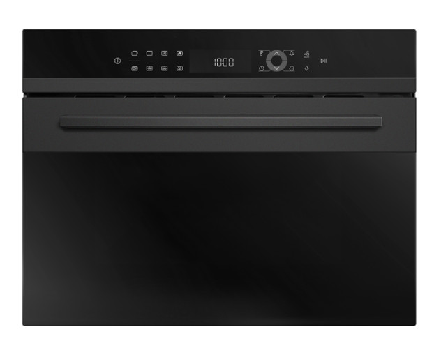 Kompakt érintőszenzoros mikrohullámú sütő. Fekete üveg dizájn, matt fekete fém fogó, 35 literes rozsdamentes acél sütőtér grill funkcióval. Érintőszenzoros vezérlés LCD kijelzővel és időzítővel. Kivehető oldalsó rácsok.